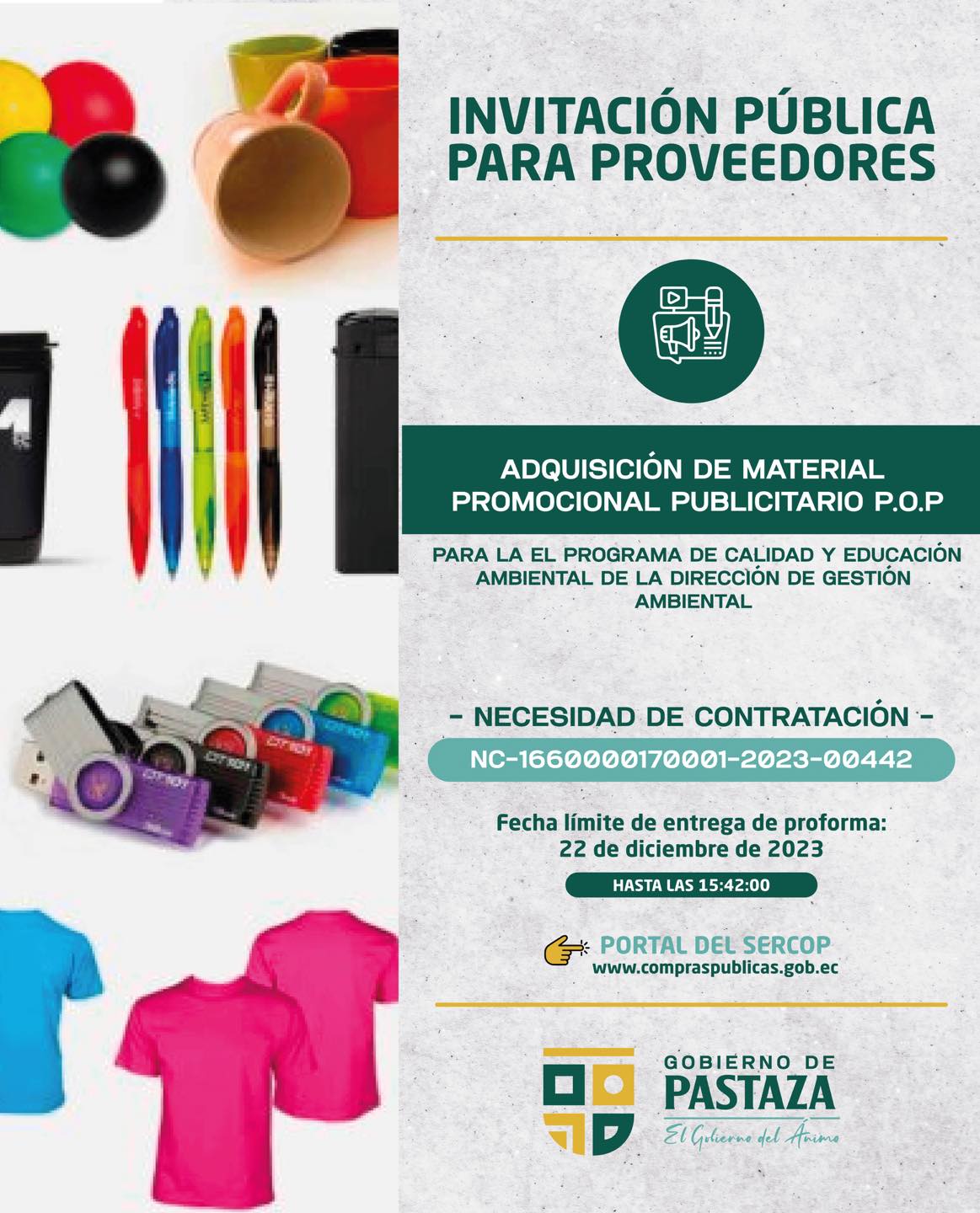 ➡️ ADQUISICIÓN DE MATERIAL PROMOCIONAL PUBLICITARIO P.O.P PARA LA EL PROGRAMA DE CALIDAD Y EDUCACIÓN AMBIENTAL DE LA DIRECCIÓN DE GESTIÓN AMBIENTAL