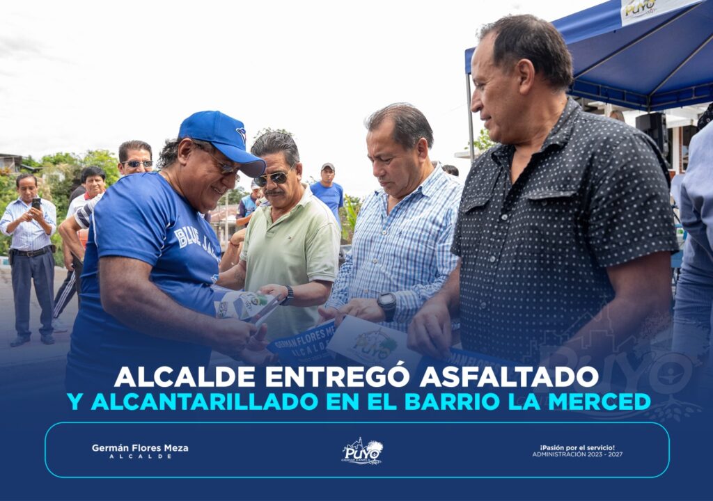 El alcalde Germán Flores Meza, junto a los concejales Wilmer Gómez, Fernando Guevara, Mónica Meza e Iván Rodríguez entregaron oficialmente el proyecto de alcantarillado sanitario, pluvial, agua potable y asfalto de las calles del Sindicato de Choferes Profesionales 4ta etapa, del barrio La Merced. Esta obra que tuvo una inversión de $513. 291 dólares incluyó la intervención de la calle Humberto More, Julio Jaramillo, Enrique Ibáñez, Carlota Jaramillo, Eduardo kigman, César Andrade y Araceli Gilbert ,cambiando totalmente la imagen del sector y por ende mejorando la calidad de sus habitantes.