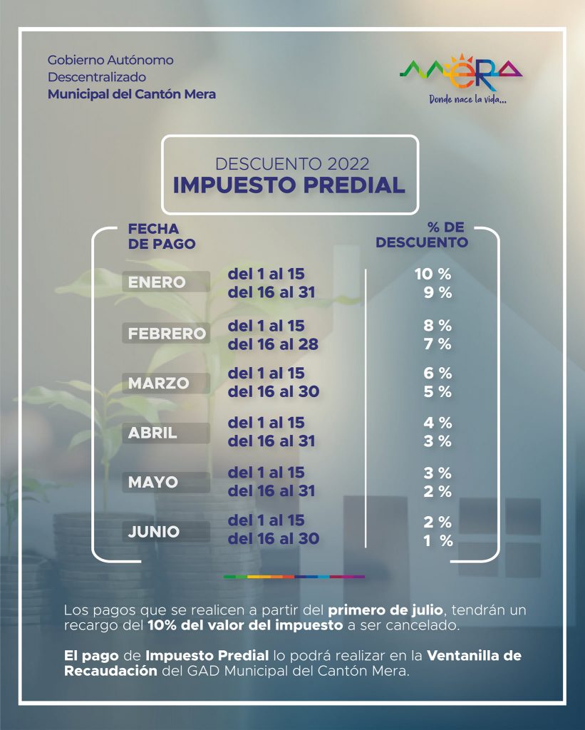 Aprovecha los descuentos en el pago del impuesto predial 2022 en la ventanilla de recaudación del GAD Municipal de Mera.