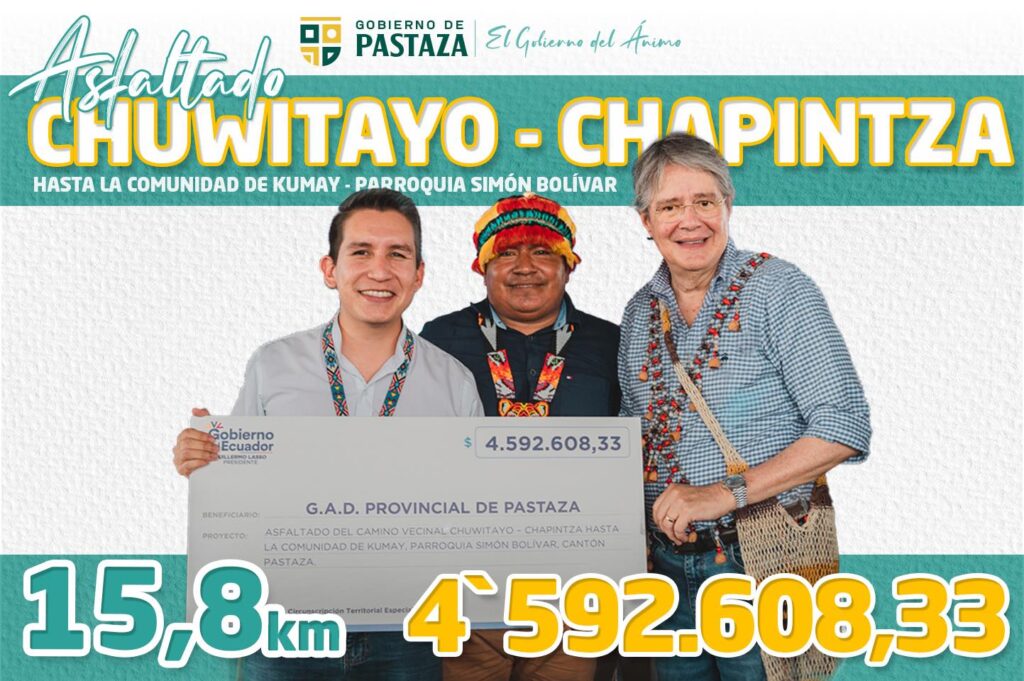 $4,594,886.49 para el proyecto de asfalto de 🚜 15.8 kilómetros de la vía Chuwitayo-Chapintza-Kumay en la Parroquia Simón Bolívar, y que beneficiarán a las comunidades de las Nacionalidades Shuar y Achuar. 👏