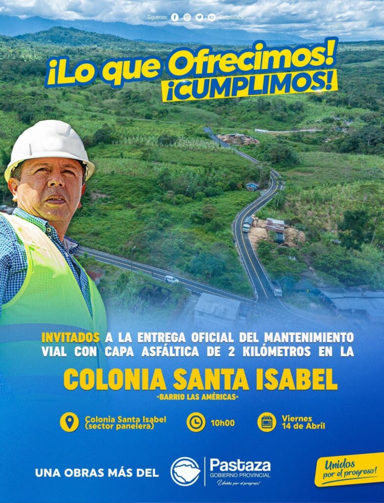 Invitamos a la ciudadanía provincial a la entrega oficial del Mantenimiento con Capa Asfáltica de 2 kilómetros del tramo Las Américas – Santa Isabel, barrio Las Américas, este viernes 14 de abril a partir de las 10 de la mañana en el sector de la panelera.