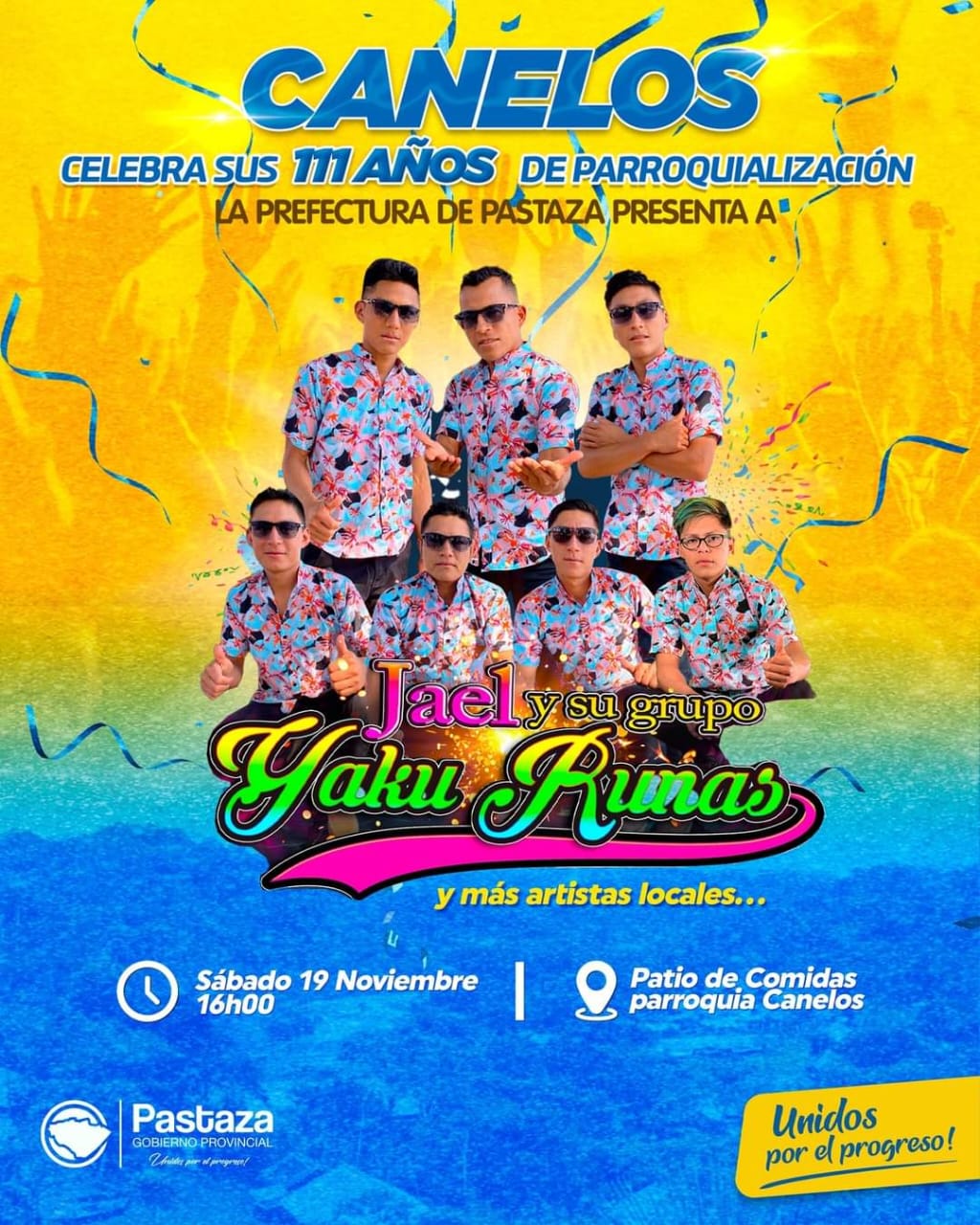 La Prefectura de Pastaza te invita este sábado 19 de noviembre, al mejor show artístico musical de todos los tiempos, al conmemorarse los 111 años de parroquialización de Canelos, con la presentación de Yaku Runas y Banda Orquesta.