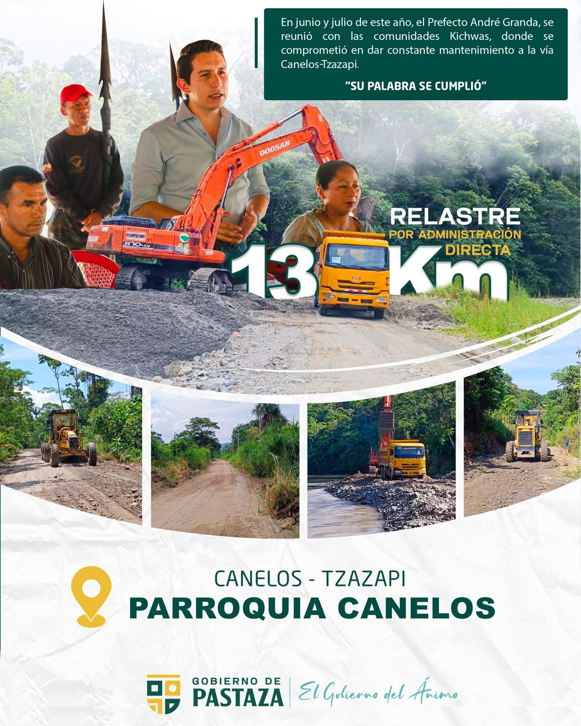 En junio y julio de este año, el Prefecto de Pastaza, André Granda se reunió con las comunidades Kichwas y sus dirigentes, donde se comprometió en dar constante mantenimiento a la vía Canelos Tzazapi.
