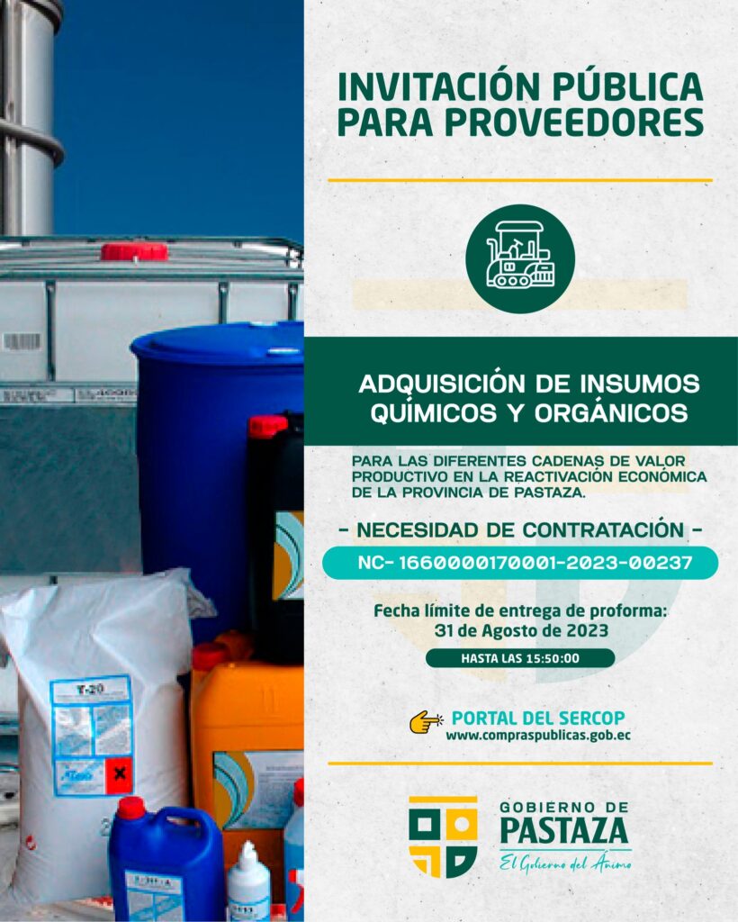 Objeto de compra: ADQUISICIÓN DE INSUMOS QUÍMICOS Y ORGÁNICOS PARA LAS DIFERENTES CADENAS DE VALOR PRODUCTIVO EN LA REACTIVACIÓN ECONÓMICA DE LA PROVINCIA DE PASTAZA.