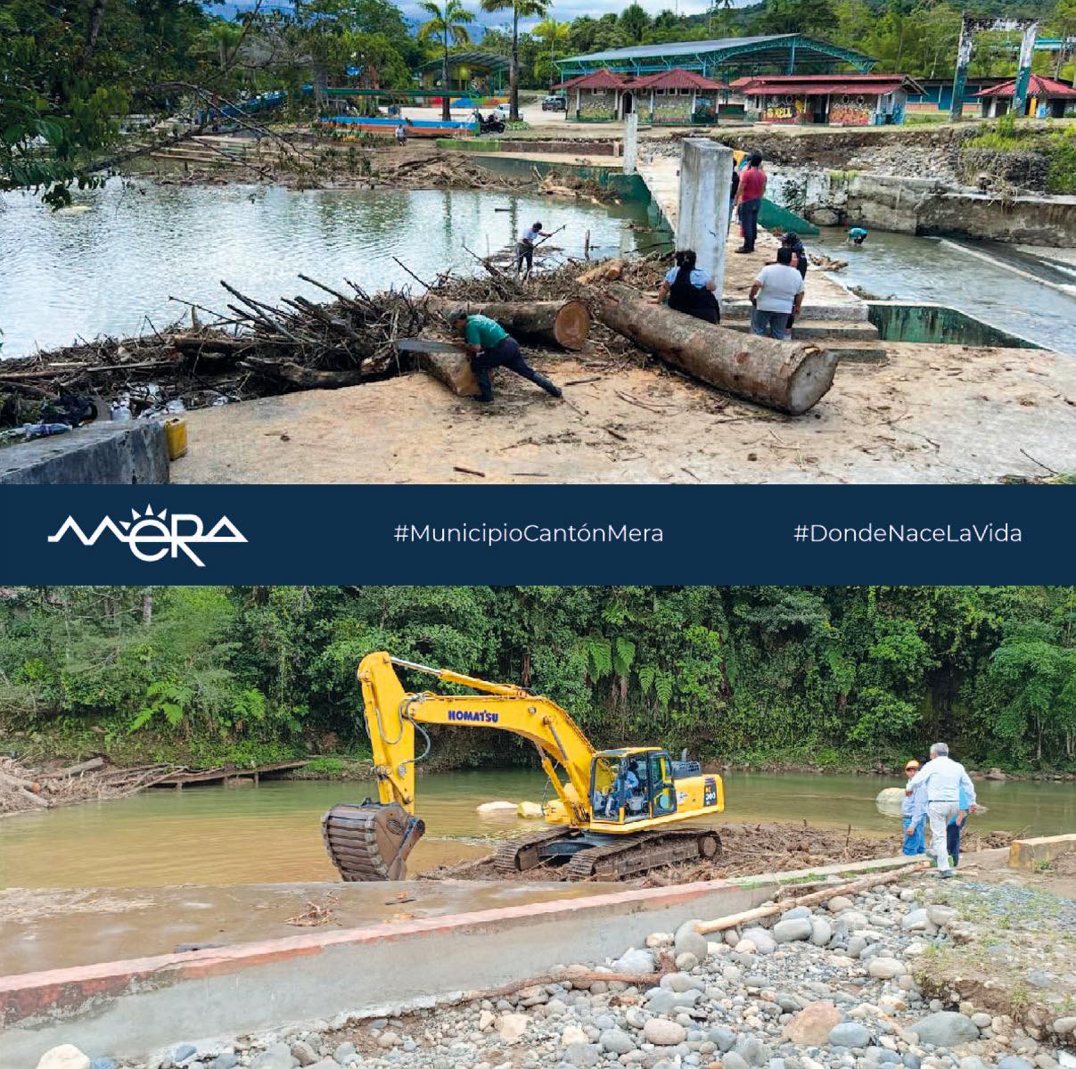 Por disposición del Arq. Guidmon Tamayo, alcalde de Mera, maquinaria institucional se dirigió al dique de la parroquia Shell, para realizar la limpieza y el retiro del material que trajo las fuertes lluvias, agradecemos el aporte ciudadano que también estuvo presente este fin de semana.