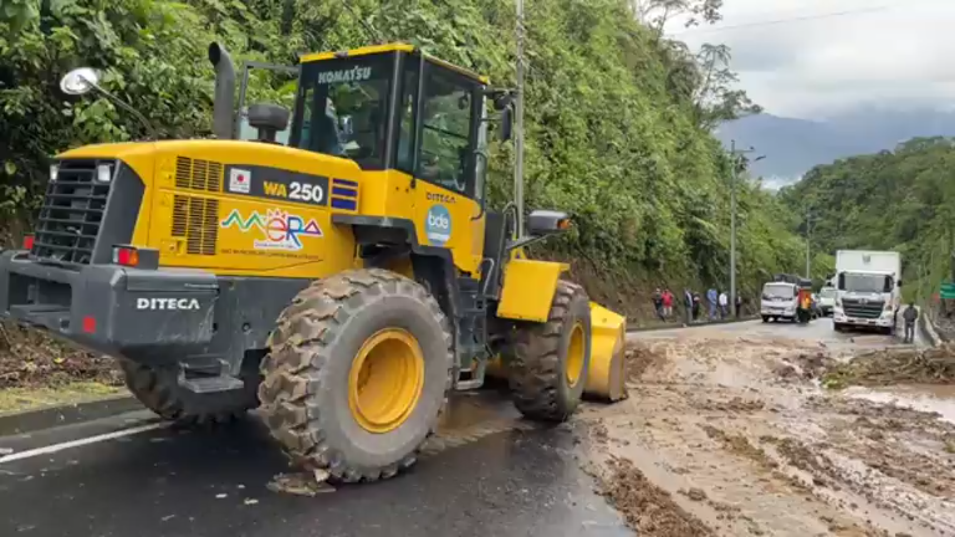 Derrumbe en la vía Mera-Shell, a la altura del Alpayaku, maquinaria institucional brinda asistencia inmediata.