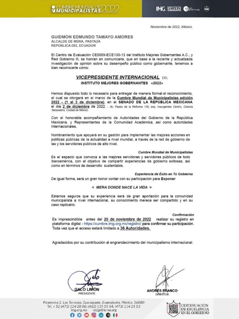 Nos complace informar a la ciudadanía que el Arq. Guidmon Tamayo, alcalde de Mera, participará de la Cumbre Mundial de Municipalistas edición 2022, en el Senado de la República Mexicana, donde recibirá el reconocimiento como Vicepresidente Internacional del Instituto Mejores Gobernantes.