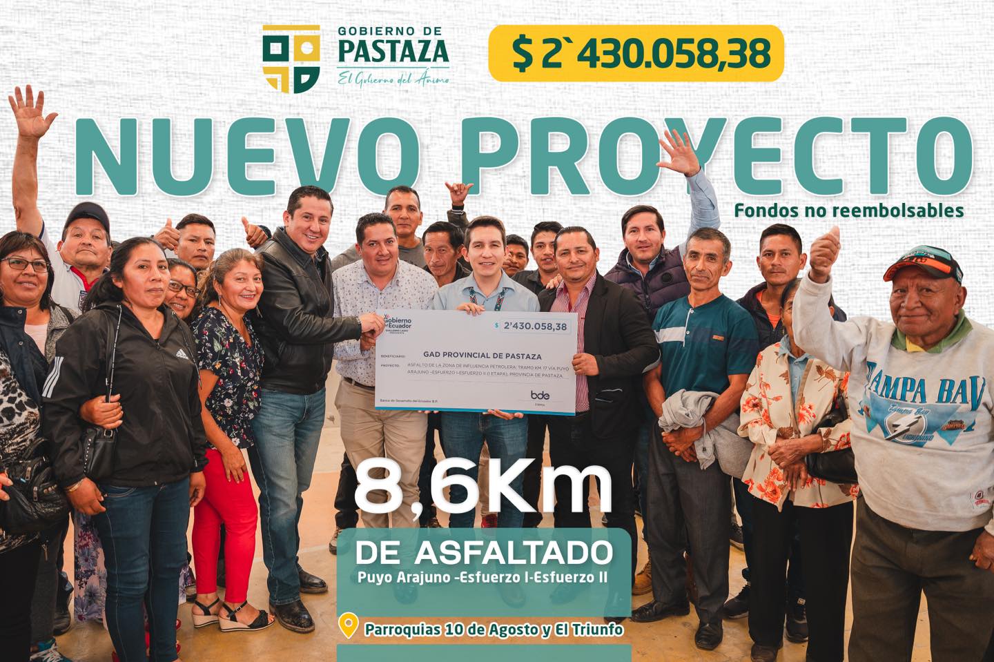 En el coliseo Pilahuín de la ciudad de Ambato, el prefecto André Granda recibió la asignación de $2’430.058,38 no reembolsables para el proyecto de asfaltado del Esfuerzo I y Esfuerzo II en las parroquias 10 de Agosto y El Triunfo ![]()