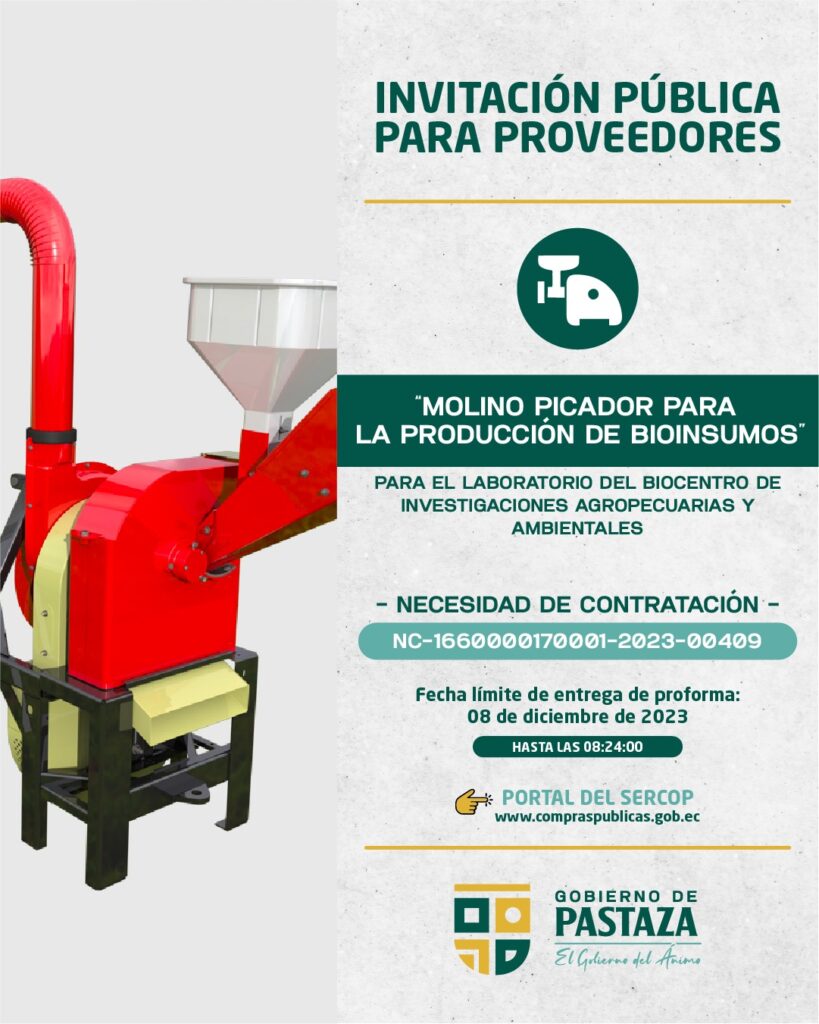ADQUISICIÓN DE UN MOLINO PICADOR PARA LA PRODUCCIÓN DE BIOINSUMOS, EN EL LABORATORIO DEL BIOCENTRO DE INVESTIGACIONES AGROPECUARIAS Y AMBIENTALES