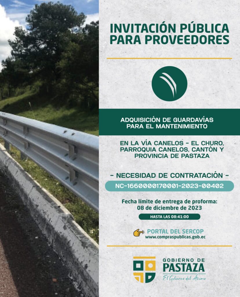 ADQUISICIÓN DE GUARDAVÍAS PARA EL MANTENIMIENTO EN LA VÍA CANELOS – EL CHURO, PARROQUIA CANELOS, CANTÓN Y PROVINCIA DE PASTAZA