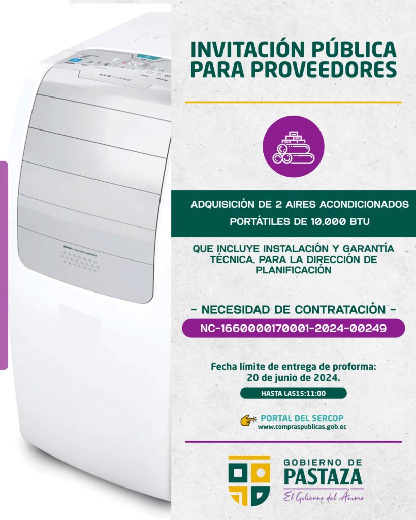 Objeto de compra: ADQUISICIÓN DE 2 AIRES ACONDICIONADOS PORTÁTILES DE 10,000 BTU, QUE INCLUYE INSTALACIÓN Y GARANTÍA TÉCNICA, PARA LA DIRECCIÓN DE PLANIFICACIÓN