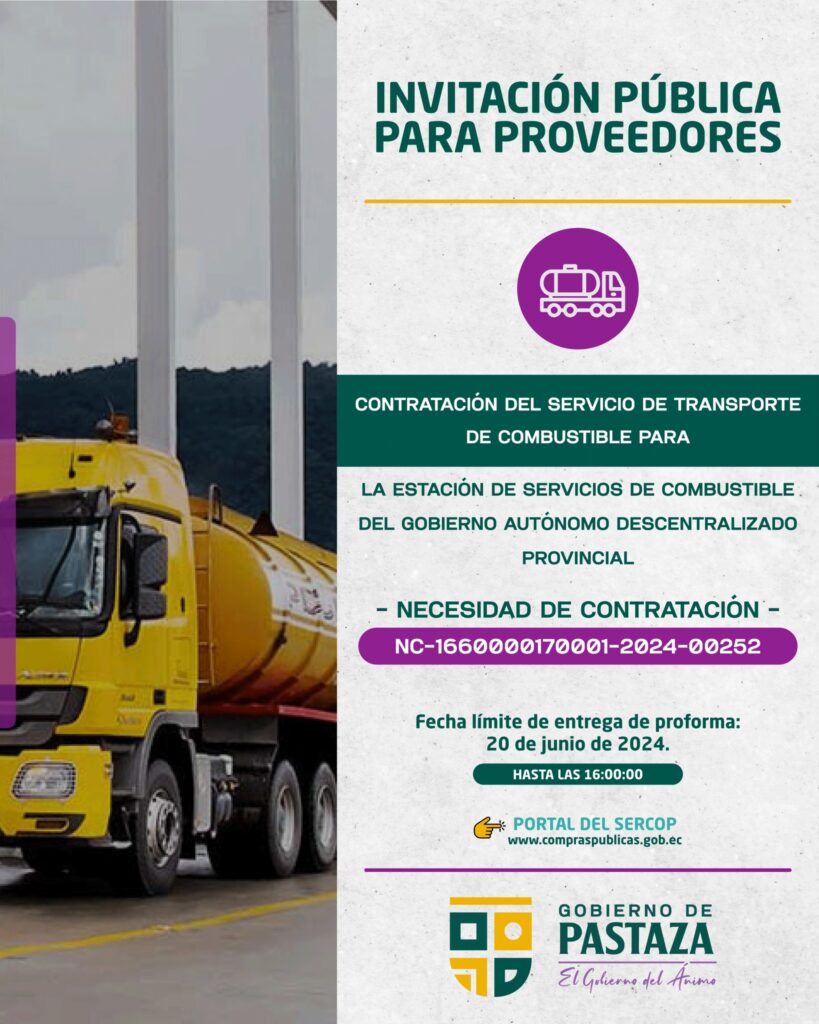 Objeto de compra: CONTRATACIÓN DEL SERVICIO DE TRANSPORTE DE COMBUSTIBLE PARA LA ESTACIÓN DE SERVICIOS DE COMBUSTIBLE DEL GOBIERNO AUTÓNOMO DESCENTRALIZADO PROVINCIAL