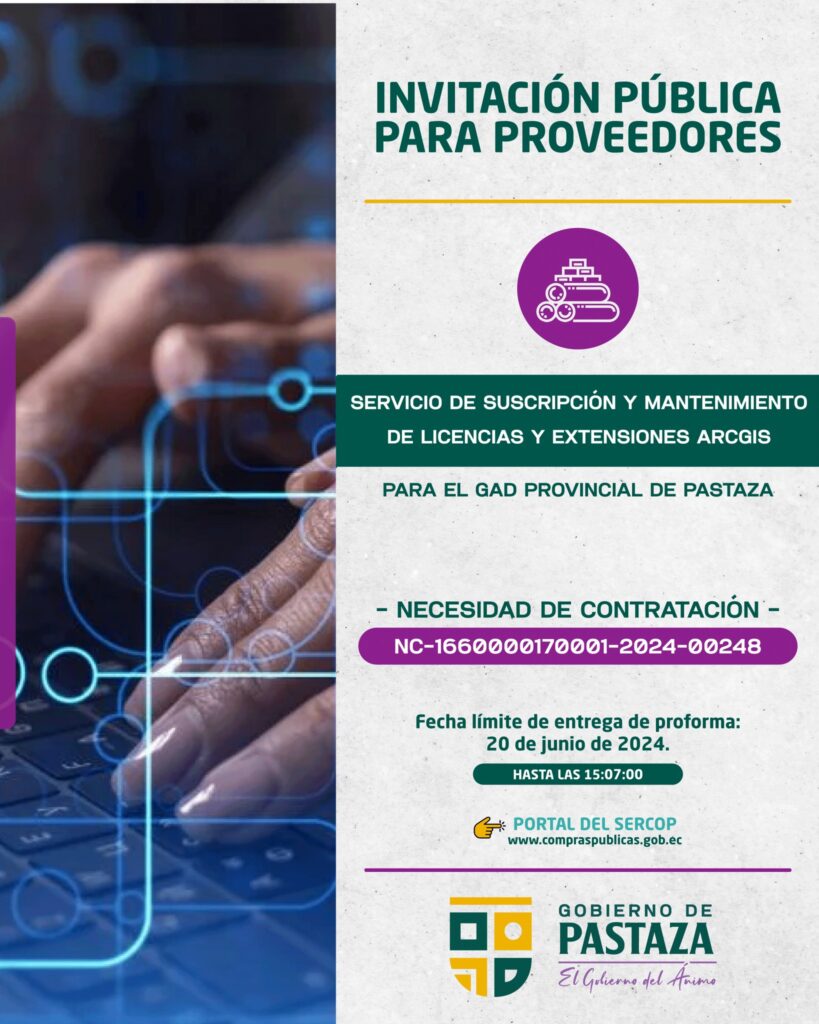 Objeto de compra: SERVICIO DE SUSCRIPCIÓN Y MANTENIMIENTO DE LICENCIAS Y EXTENSIONES ARCGIS PARA EL GAD PROVINCIAL DE PASTAZA