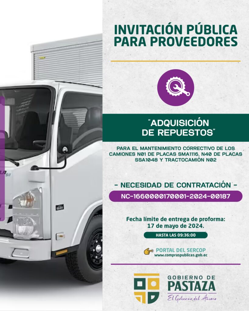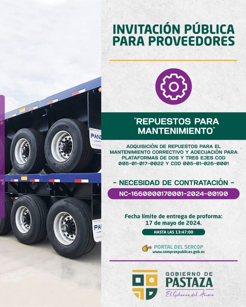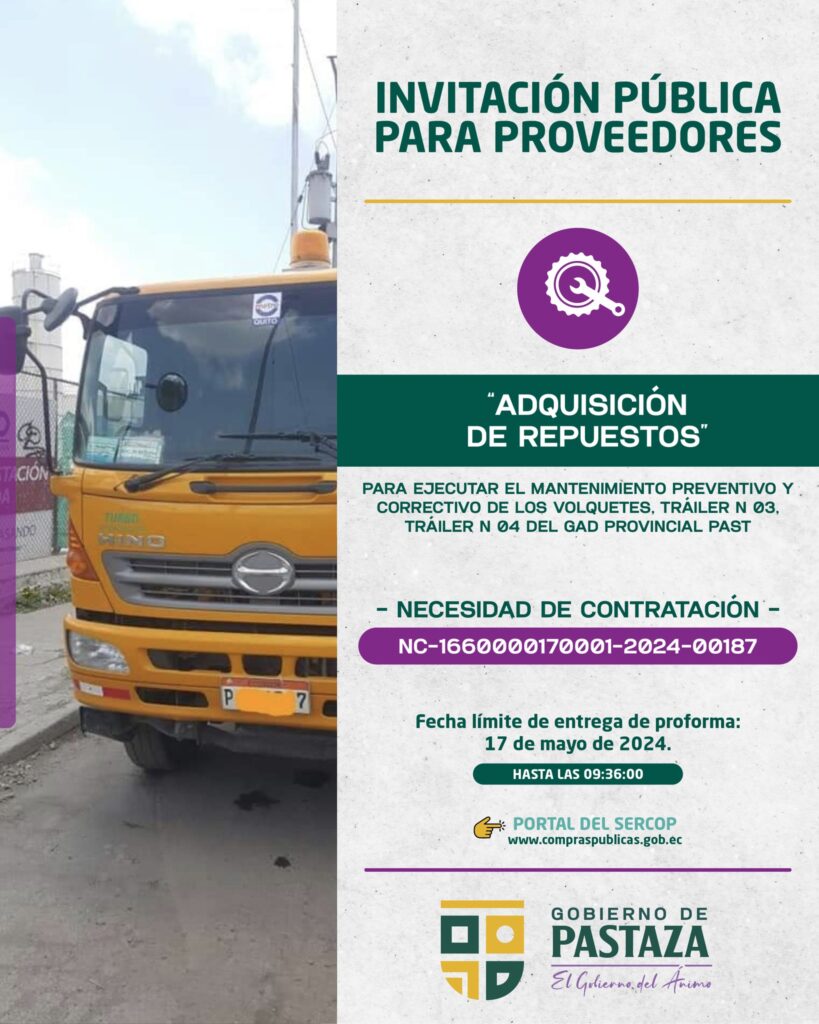 5️⃣Objeto de compra: ADQUISICIÓN DE REPUESTOS PARA EJECUTAR EL MANTENIMIENTO PREVENTIVO Y CORRECTIVO DE LOS VOLQUETES, TRÁILER N 03, TRÁILER N 04 DEL GAD PROVINCIAL PASTAZA