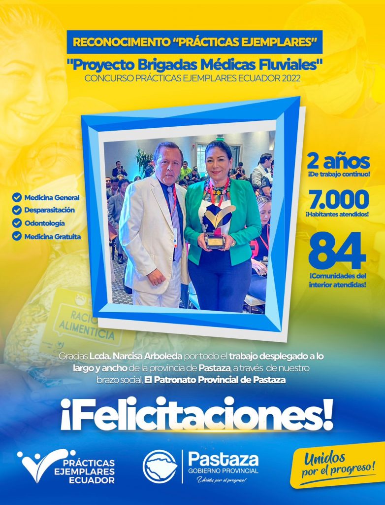 El Proyecto Brigada Médica Fluvial fue reconocido como práctica ejemplar, el mismo es desplegado en la provincia atendiendo en temas de salud a 7000 ciudadanos asentados en 84 comunidades de acceso fluvial de Pastaza.