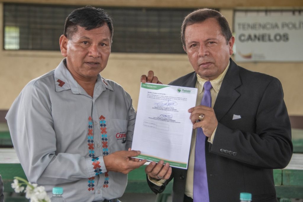 La Sesión Solemne conmemorativa por el Centésimo Décimo Primer Aniversario de parroquialización de Canelos fue el espacio idóneo en el que la Prefectura de Pastaza exteriorizó el saludo fraterno a los hombres, mujeres y niños que conforman ese importante centro poblado de nuestra provincia, a los que se ha atendido diligentemente tanto en obra pública como con la entrega de alevines, asistencias veterinarias, gestión ambiental, turismo sostenible, comercialización entre otras, apoyo cuya inversión asciende a los 3´174.965,86 dólares.