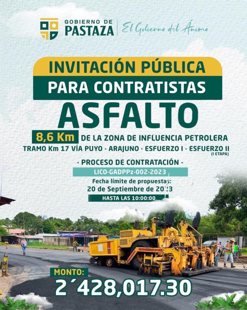 ASFALTO DE LA ZONA DE INFLUENCIA PETROLERA: TRAMO KM 17 VÍA PUYO- ARAJUNO – ESFUERZO I – ESFUERZO II (I ETAPA), L=8.6KM, PROVINCIA DE PASTAZA