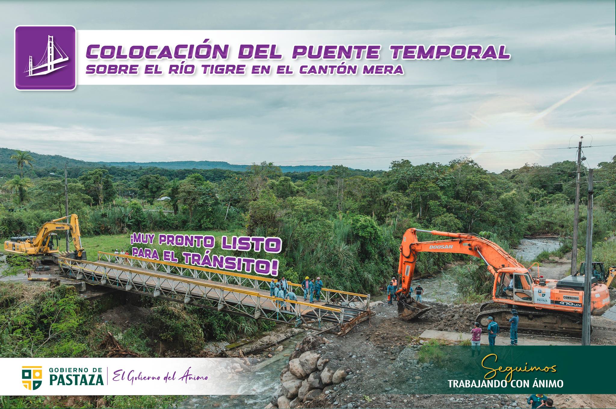 El puente ha sido colocado y está casi listo para el tránsito, como una medida temporal mientras se construye el puente definitivo, que estará terminado en pocos meses. ¡Seguimos! Agradecemos el apoyo interinstitucional del Municipio Cantón Mera![]()