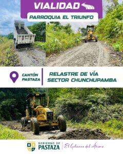 En la parroquia El Triunfo, cantón y provincia de Pastaza, avanzamos con el proyecto de relastre de la vía en el sector Chunchupamba. Actualmente, la obra tiene un 50% de avance.