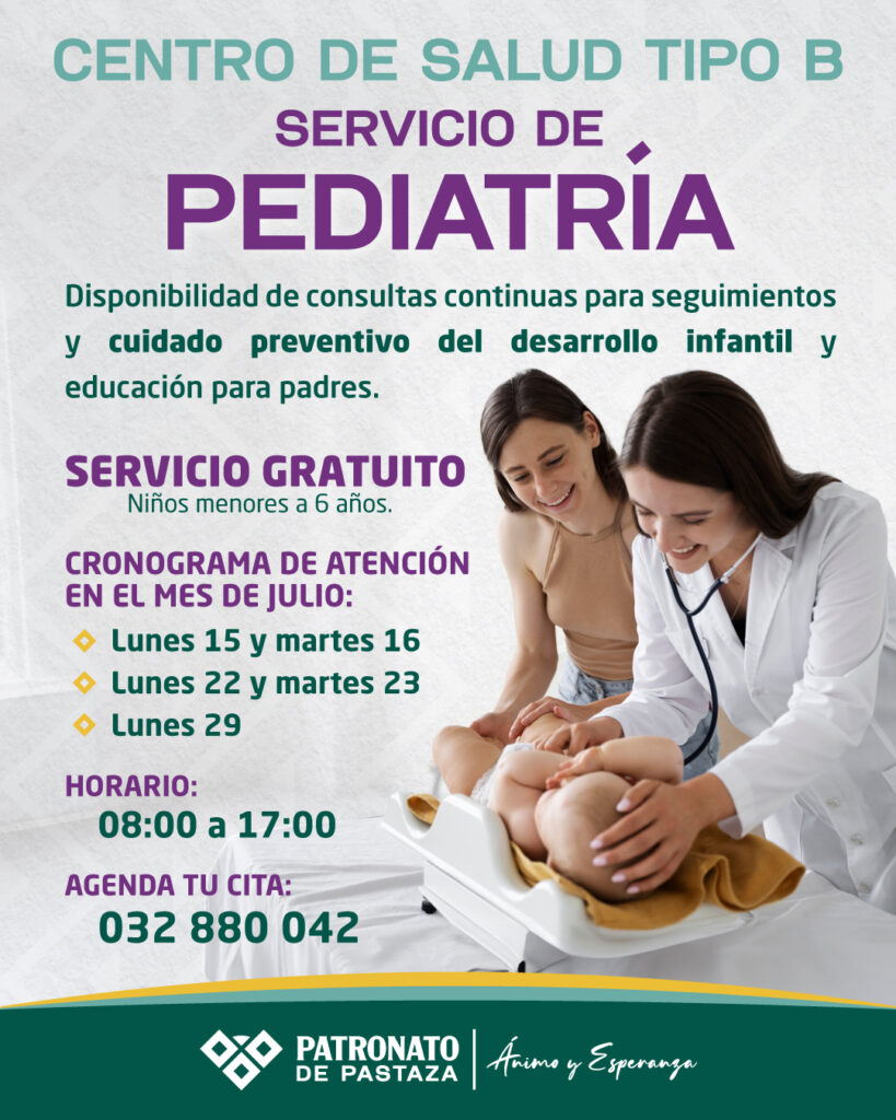 El Patronato de Pastaza ofrece el servicio de PEDIATRÍA en el Centro de Salud Tipo B. Consultas continuas para seguimientos y cuidado preventivo del desarrollo infantil y educación para padres.