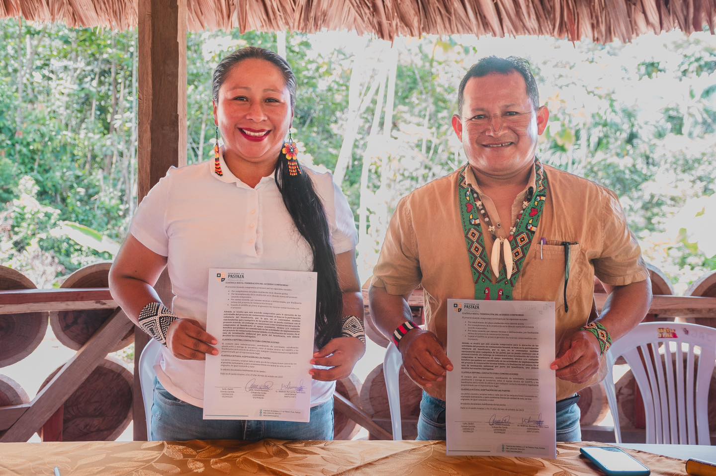 para el Consentimiento de la Restauración en Zonas Degradadas en la Parroquia Arajuno con la Organización Kuraray – Liquino, para la restauración de 1100 hectáreas de bosque.![]()